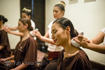 Traditional Thai massage using a herbal balm applied to the main muscle groups for its heating effect.